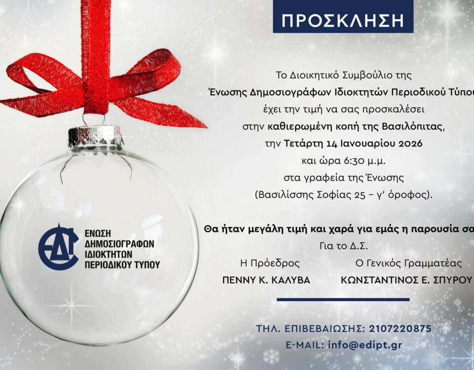 Το Διοικητικό Συμβούλιο της Ένωσης Δημοσιογράφων Ιδιοκτητών Περιοδικού Τύπου έχει την τιμή να σας προσκαλέσει στην καθιερωμένη κοπή της Βασιλόπιτας, την Τετάρτη 14 Ιανουαρίου 2026 και […]