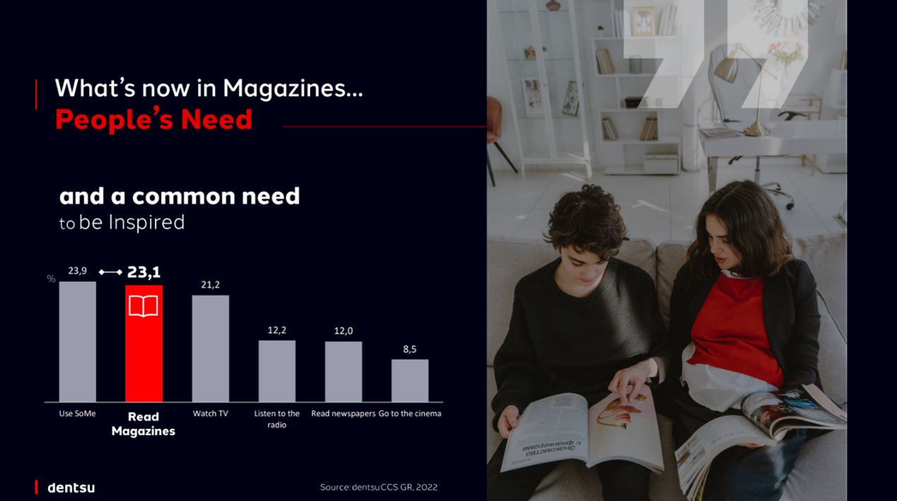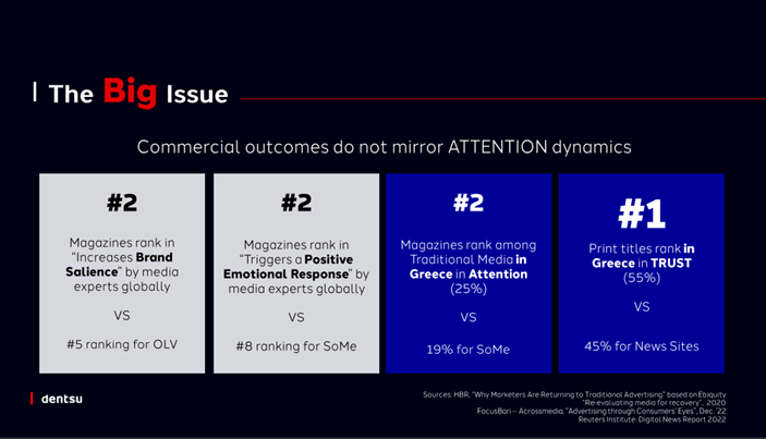 Τέλος, μιλώντας από την πλευρά της διαφημιστικής αγοράς, ο κ. Πέτρος Καραχάλιος Μέλος Δ.Σ. Ένωσης Διαφήμισης & Επικοινωνίας παρουσίασε έρευνες που δίνουν στα περιοδικά τη δεύτερη θέση όσον αφορά τις τάσεις της εποχής. Έτσι με βάση έρευνα της Dentsu “Magazine: A place of their own, in the Greek Media Landscape” τα περιοδικά κατατάσσονται δεύτερα όσον αφορά στο κομμάτι της προσοχής (attention) με ποσοστό 25% και ακολουθούν τα social media με ποσοστό 19%. Παράλληλα, όμως, βρίσκονται στην πρώτη θέση στο κομμάτι της εμπιστοσύνης (trust) με ποσοστό 55%. Στο ερώτημα αν ο Τύπος πέθανε, ο κ. Καραχάλιος απάντησε ότι «Πολλοί θα πουν ότι ο Τύπος πέθανε. Δεν είναι αληθές, εντούτοις όμως βρίσκεται σε μία στασιμότητα, ενώ παράλληλα υπάρχει μία έκρηξη στο κομμάτι της ψηφιακής έκδοσης του Τύπου. Τα περιοδικά δεν επιβιώνουν, δεν πεθαίνουν, αλλά συγκλίνουν».